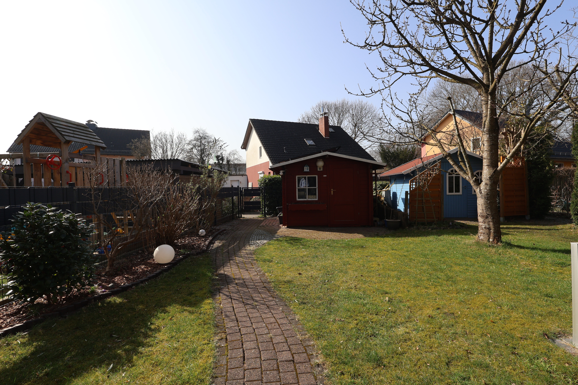 Außenbereich: Gepflegter Garten, Gartenhaus, Balkon und Terrasse mit Überdachung.