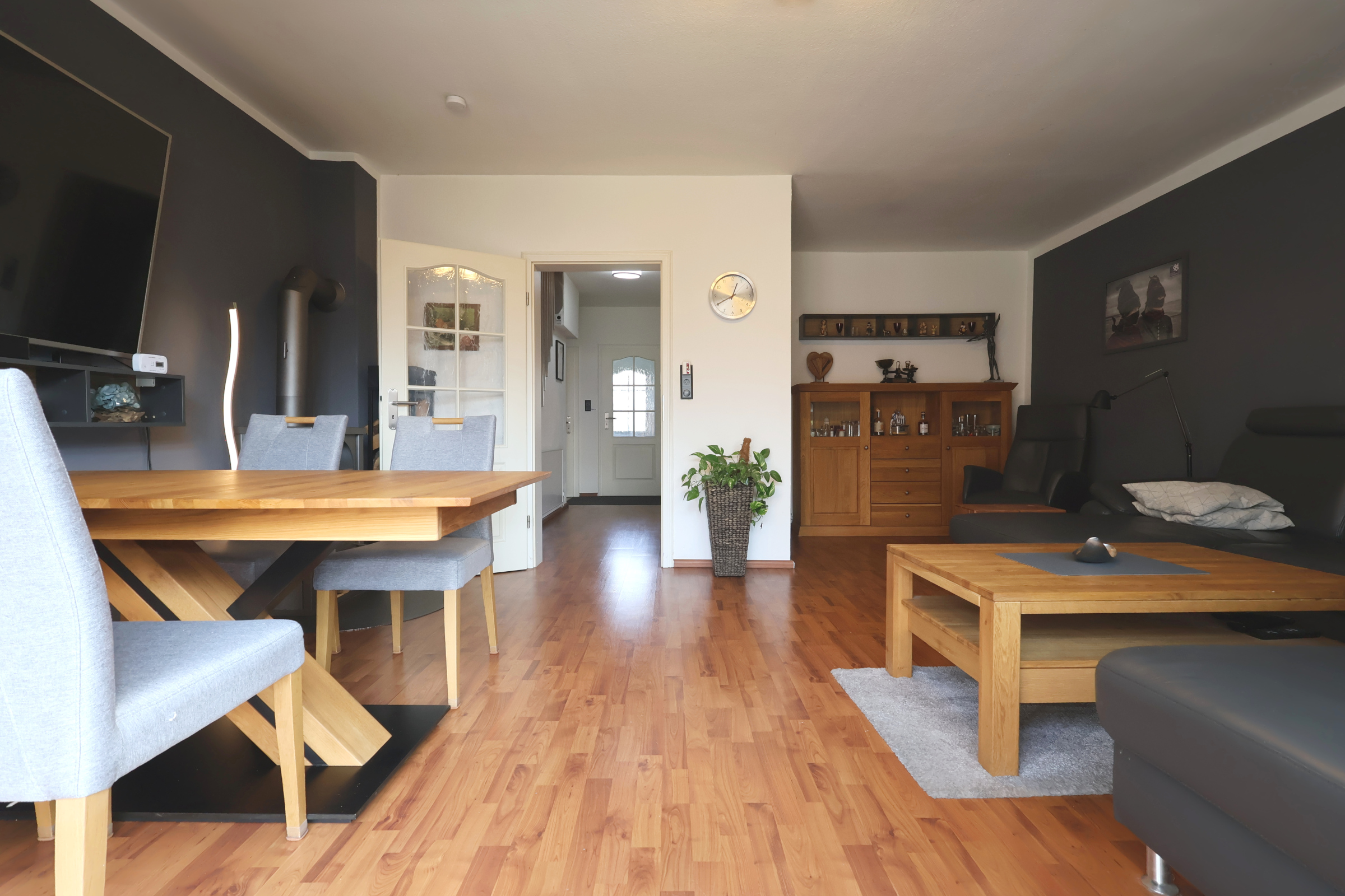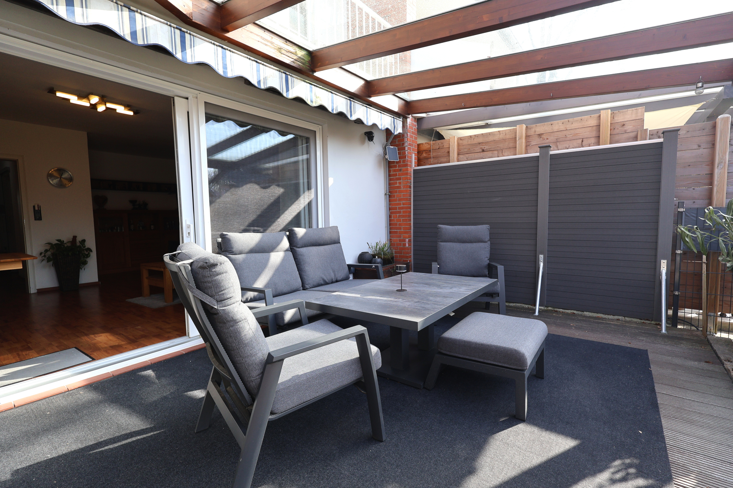 Der Wohnbereich besticht durch einen schönen Laminatboden und die große Glasfront (2007), die den Raum mit Licht flutet. Die Schiebetür führt direkt auf die überdachte Terrasse. Für gemütliche Winterabende sorgt der Kaminofen (2002).